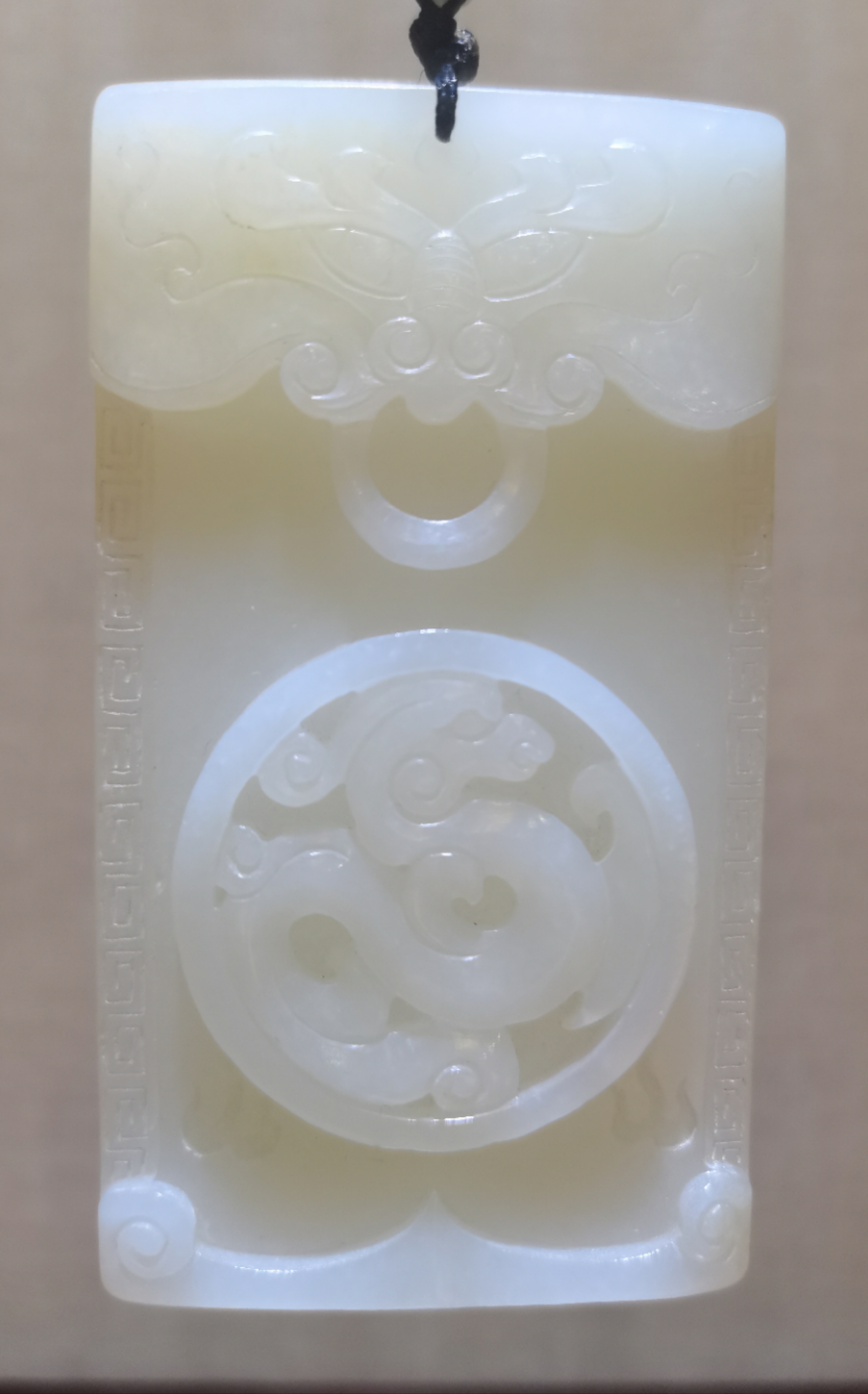 此款玉牌牌型方正,以椒圖鼻梁為中線,兩側紋飾作對稱排列,椒圖怒目而視,露齒銜環(huán),莊重威嚴。下刻飛龍圖騰,闡釋了椒圖為龍之九子的傳說。兩側飾以回形紋,寓意吉祥如意,其后又呼應以半壁形的乳釘紋。整塊玉牌如一扇莊重氣派的大門,透露著威嚴、權勢和貴氣。
