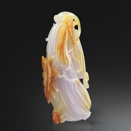 紫羅蘭底色,晶瑩純凈,紋路清晰流暢,俏色精巧。